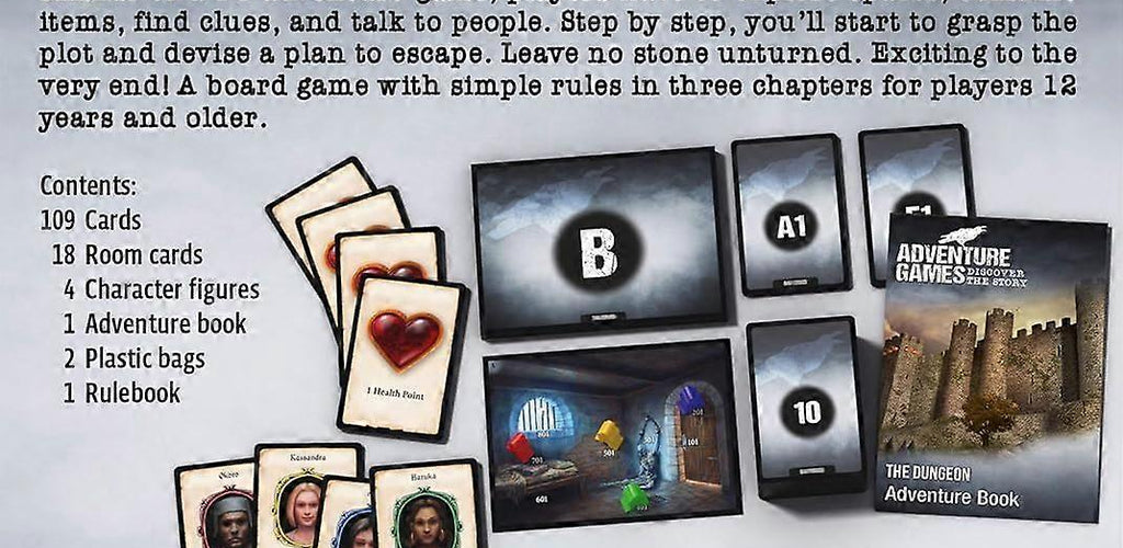 What’s in the box: adventure book, room and item cards, character pieces, game components, and instruction guide