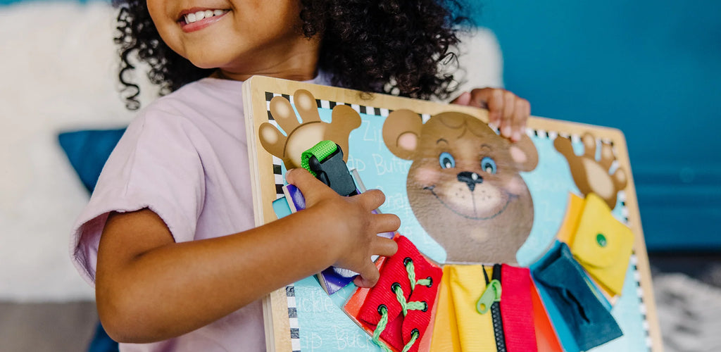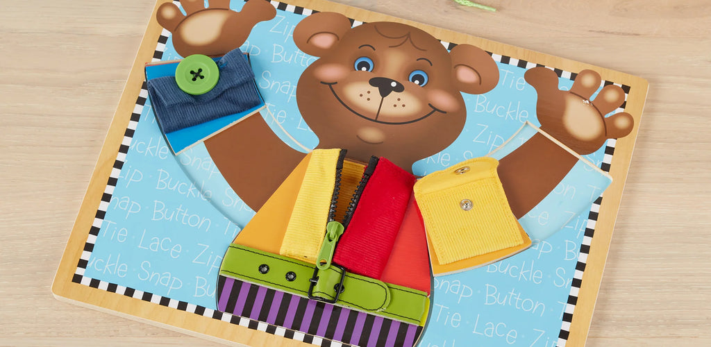 Interactive wooden puzzle board with six dressing activities: zip, buckle, snap, lace, button, and tie. 🧸