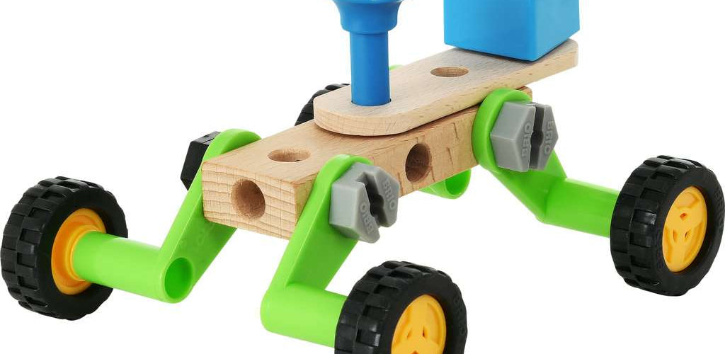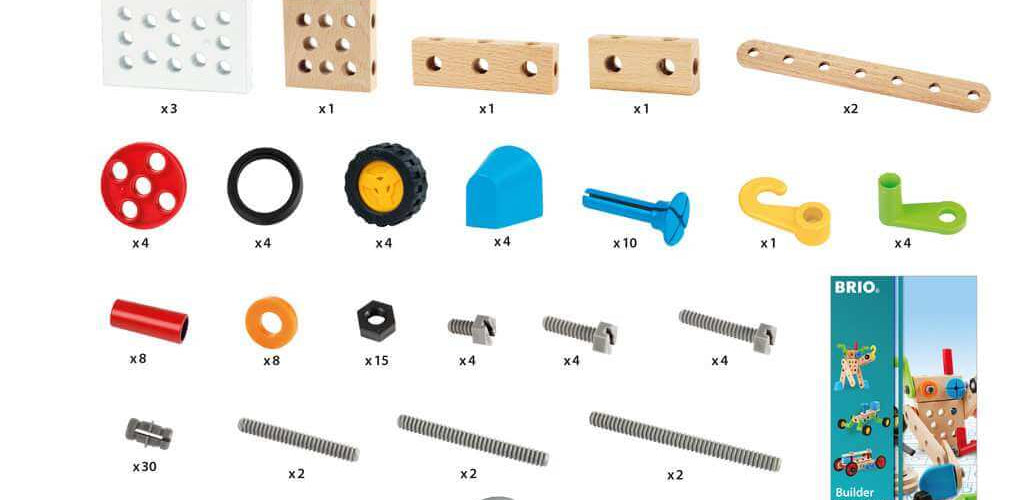 What’s in the box: 136 BRIO Builder pieces including tools, bolts, connectors, wheels, and wooden blocks.
