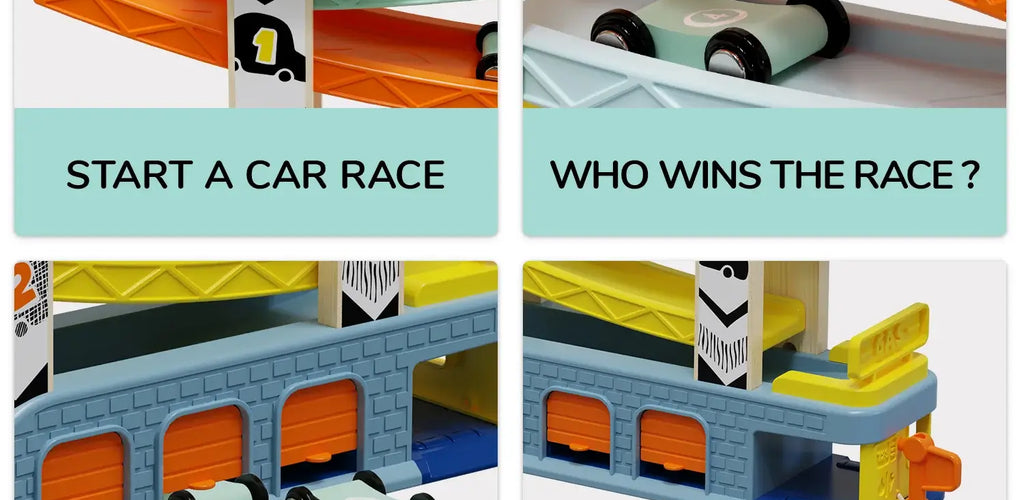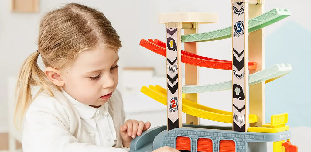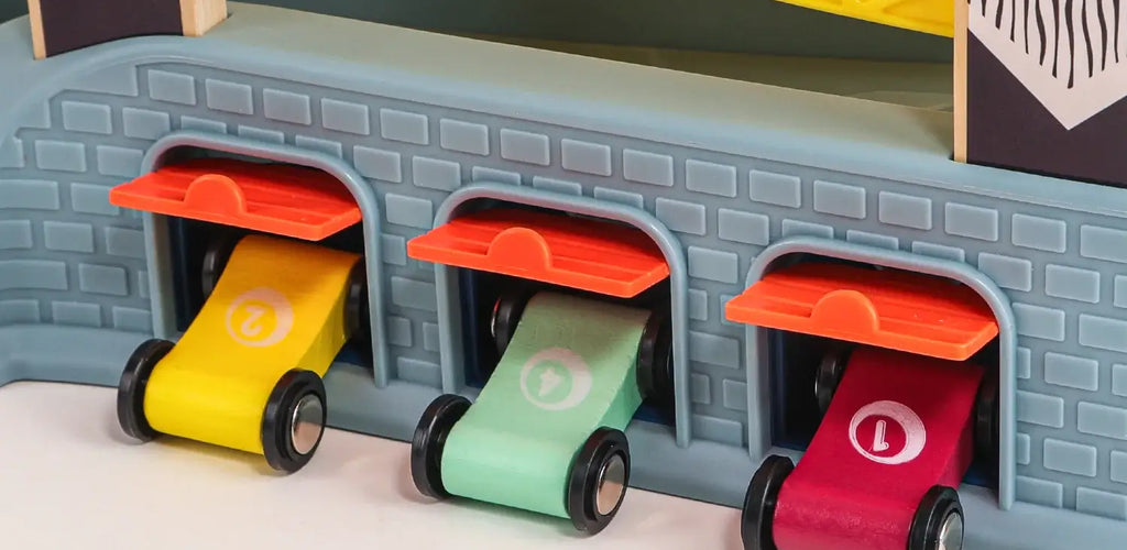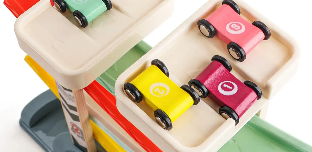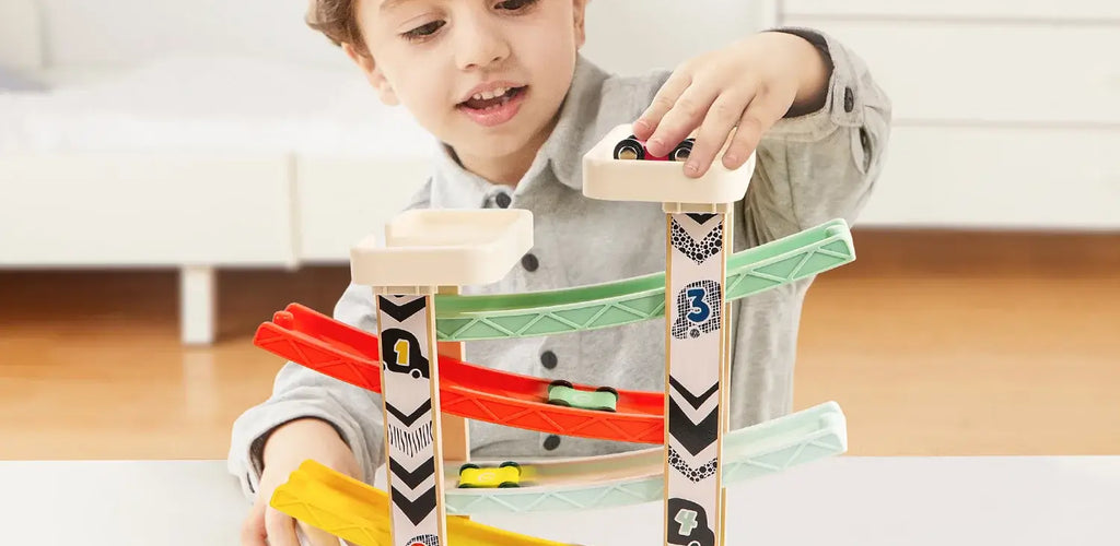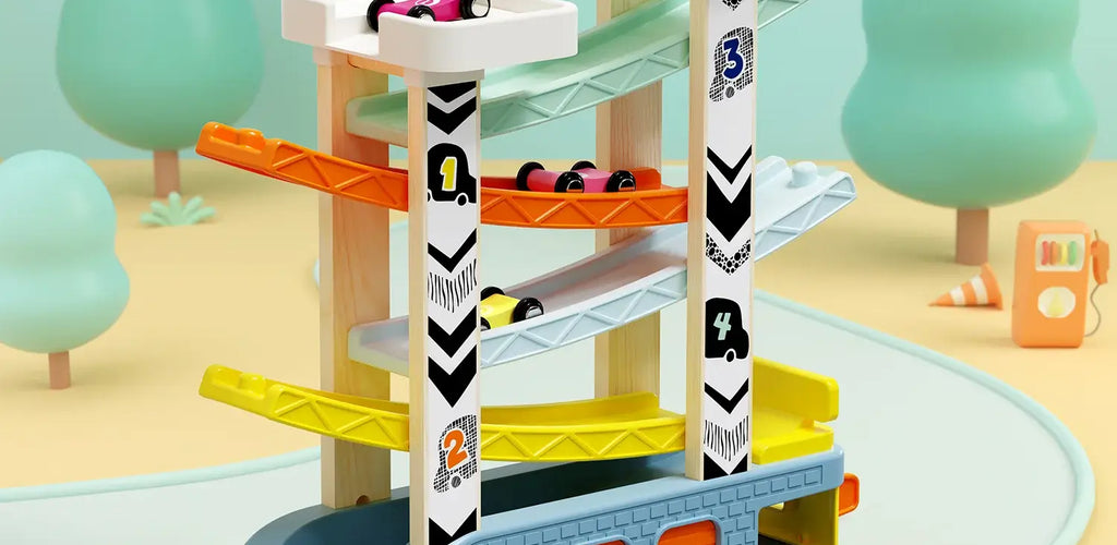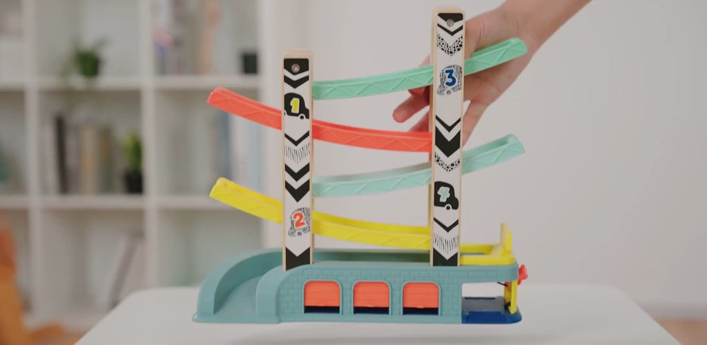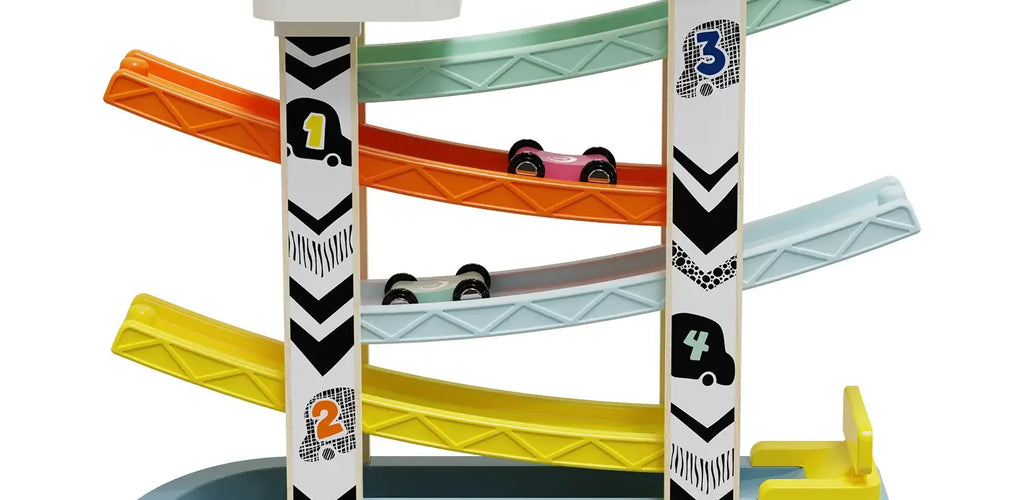 Cars zip down the sloping ramps, encouraging observation and turn-taking