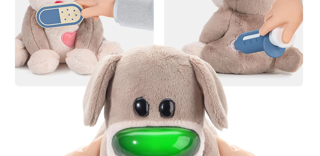 Includes plush dog, medical tools (stethoscope, thermometer, etc.), and interactive injury features 🩺