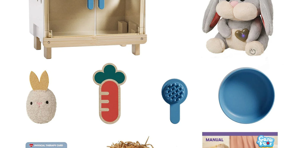 Children use a diagnosis card, gentle touch, and a carrot accessory to comfort and care for Mummy Bunny