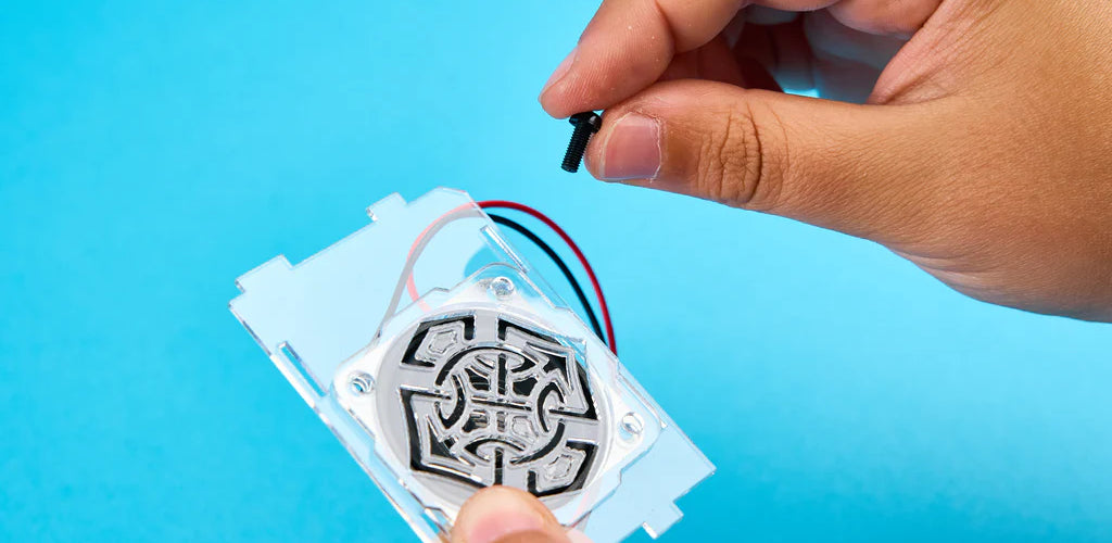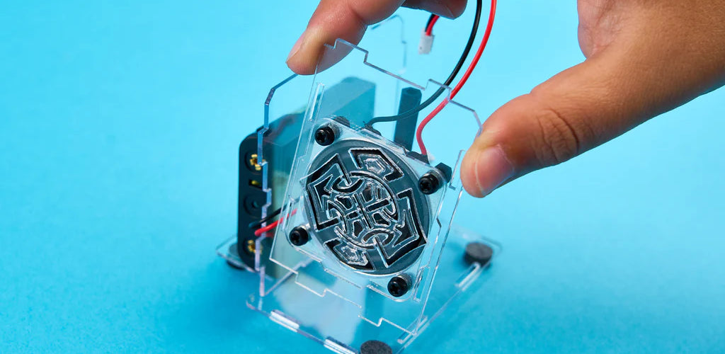 What’s in the box: printed circuit board (PCB), Bluetooth speaker module, LEDs, acrylic housing, screws and spacers, decorative stickers, screwdriver, instruction booklet, collectible card, CR2032 demo battery, and unlock token for the Bit console