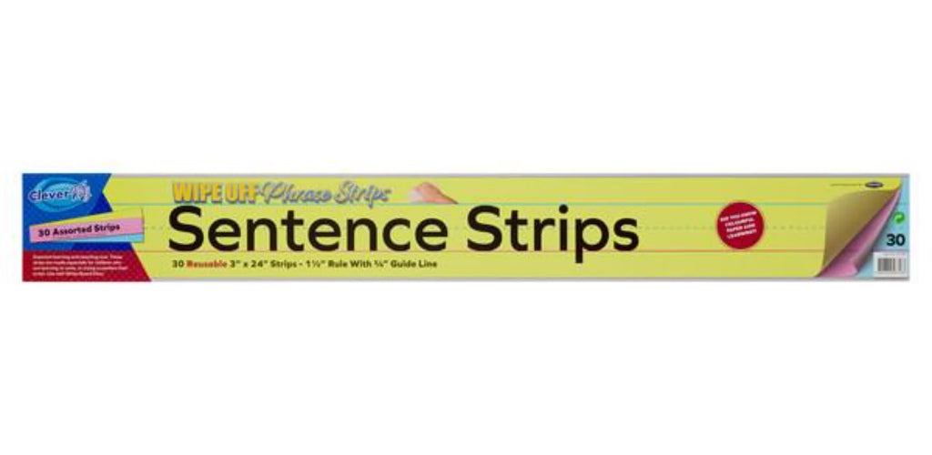 Includes 31 coloured wipe-off sentence strips, sized 3″ × 24″ (approximately)