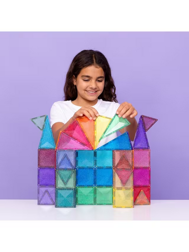 Includes 48 glittering magnetic tiles in pastel and rainbow colors: 32 squares, 8 equilateral triangles, and 8 isosceles triangles.
