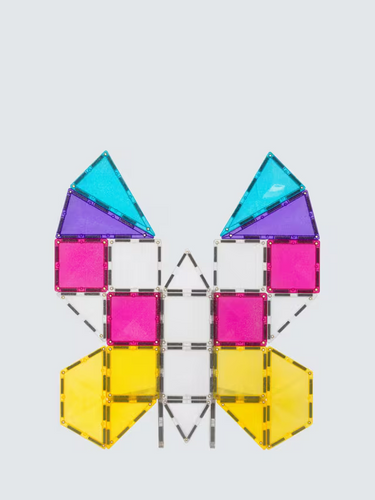Includes 56 glitter magnetic tiles in dazzling colors of pink, yellow, teal, and purple.