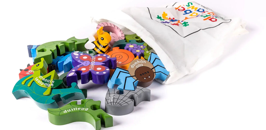 Bug-themed wooden jigsaw puzzle with labels in Irish π