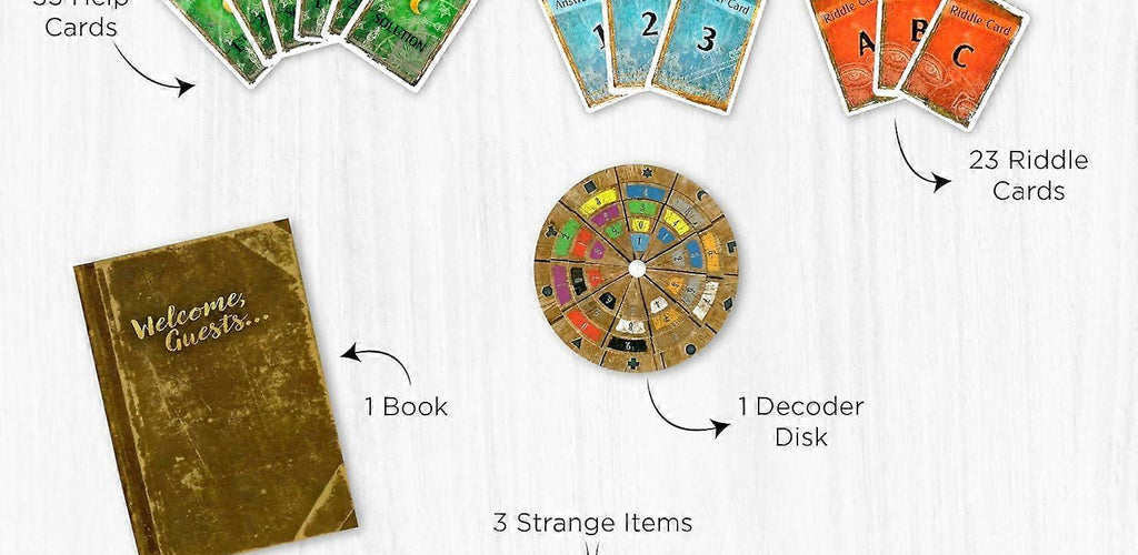 Materials & components: Includes riddle cards, a decoder disk, booklet, and themed puzzle items that players will interact with to solve clues.