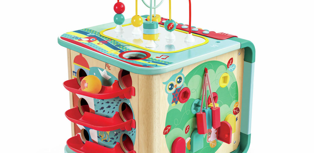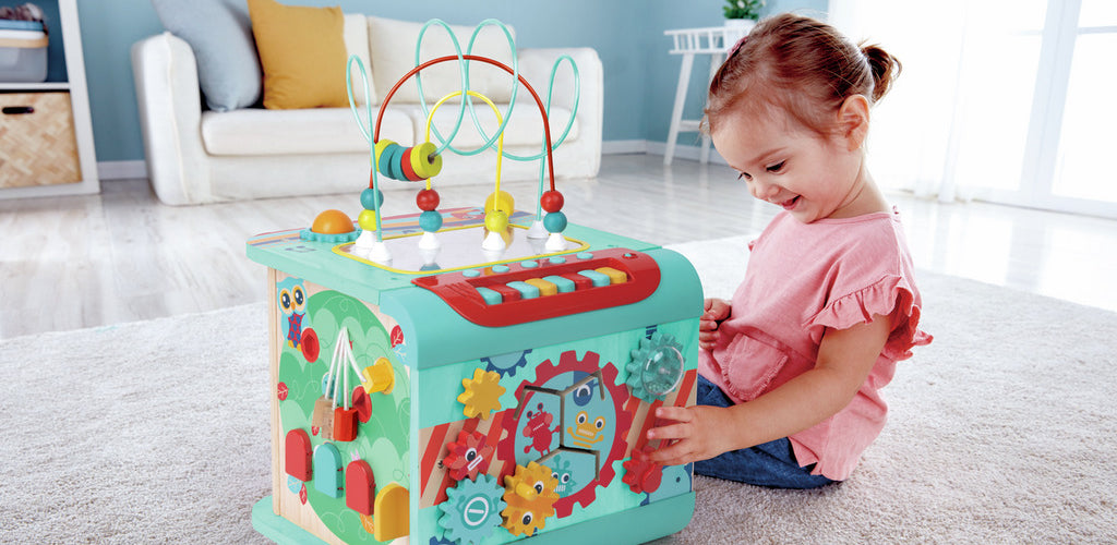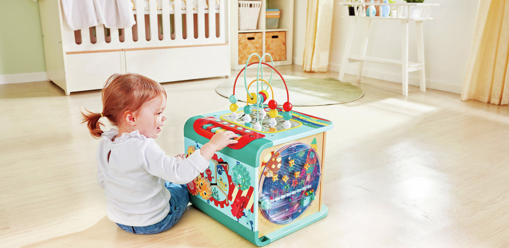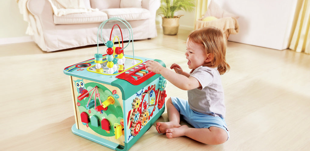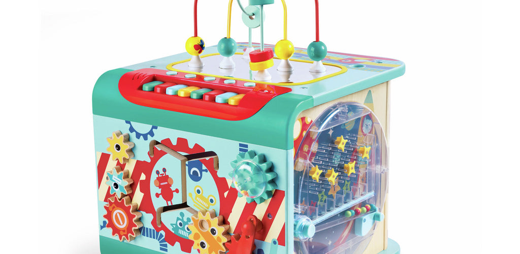 A colorful multifunctional cube designed to keep babies and toddlers engaged with 5 sides of interactive play 🧊