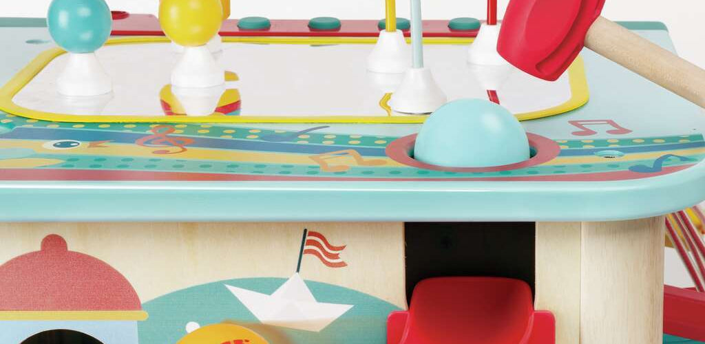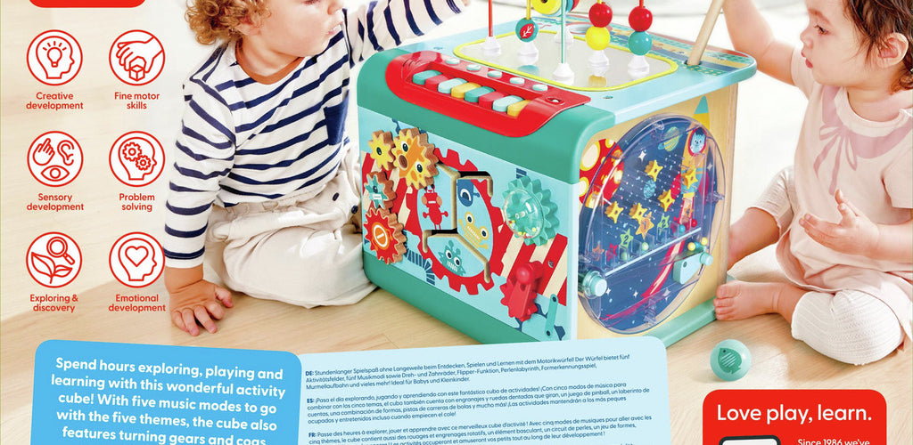 What’s in the box: Activity cube featuring a shape sorter, bead maze, ball run, music buttons, gears, cogs, and pinball-style play elements 🎶