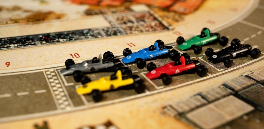 Comes with 6 car miniatures, matching gear and heat decks, and individual player boards.