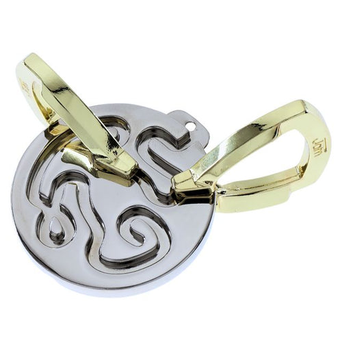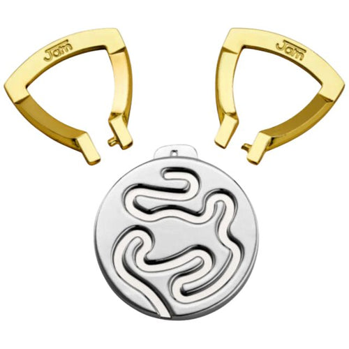 Three interlocked pieces form a puzzle that must be twisted and repositioned