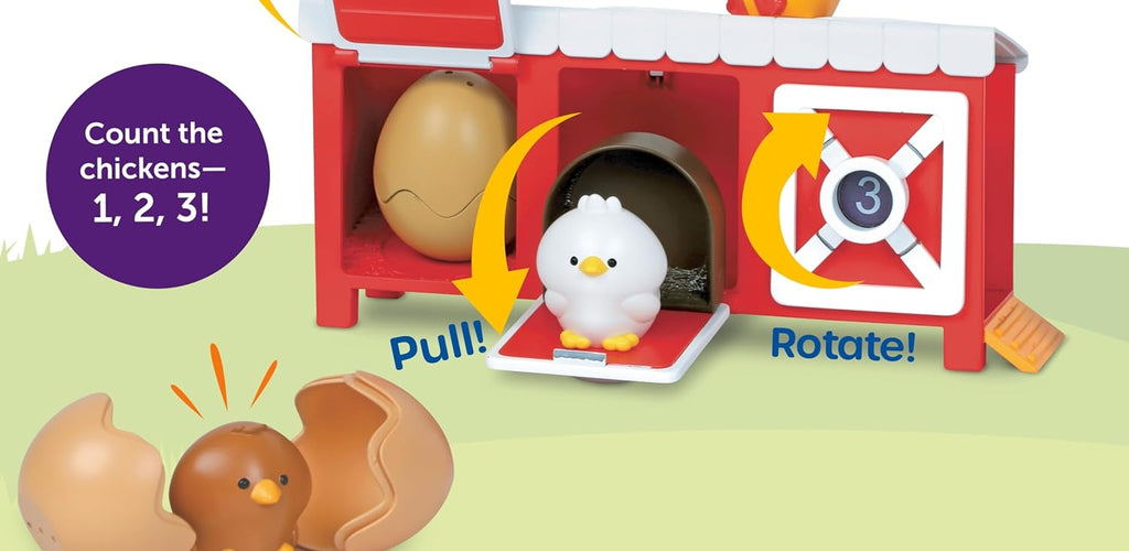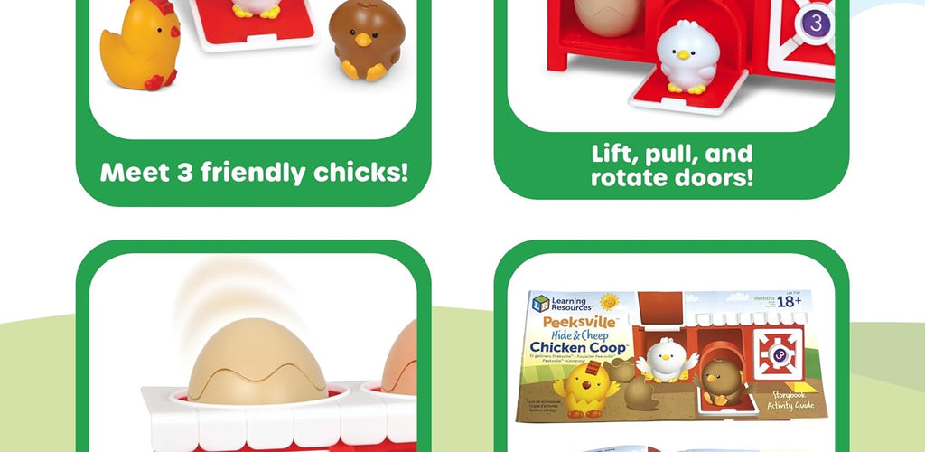 Encourages fine motor development, cause-and-effect understanding, memory skills, and imaginative storytelling as children drop eggs into the coop and unlock the peekaboo surprises by lifting, pulling, or rotating the doors