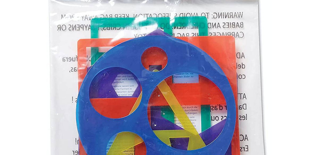 Includes 5 labeled, 7.5" × 4.5" translucent plastic templates: circle, triangle, rectangle, square, and hexagon—perfect for tracing and exploring in multiple orientations and sizes