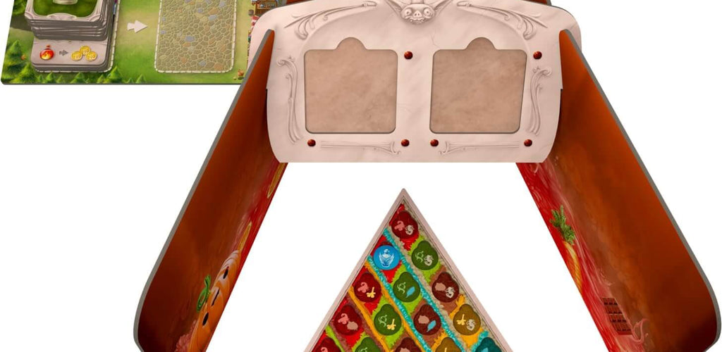 What’s in the box: 4 player screens, 4 ingredient holders, 4 triangular trackers, 4 tiny bottles, 33 ingredient tiles, 48 coins, 60 result tokens, market board, 3 customer tiles, 1 closed market tile, key stickers, 6 sealed mystery boxes, rulebook