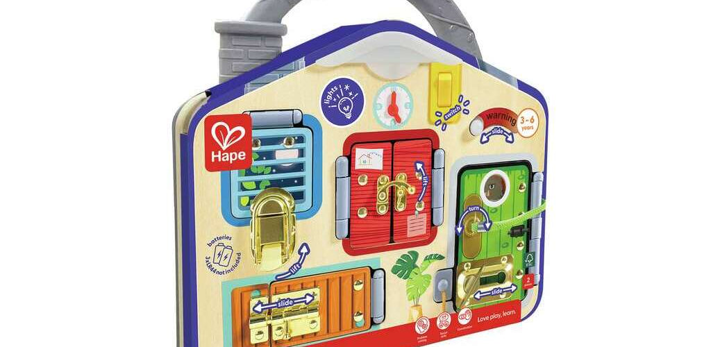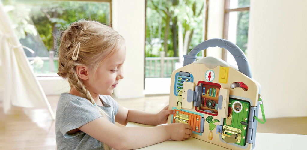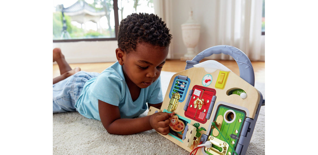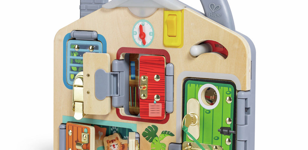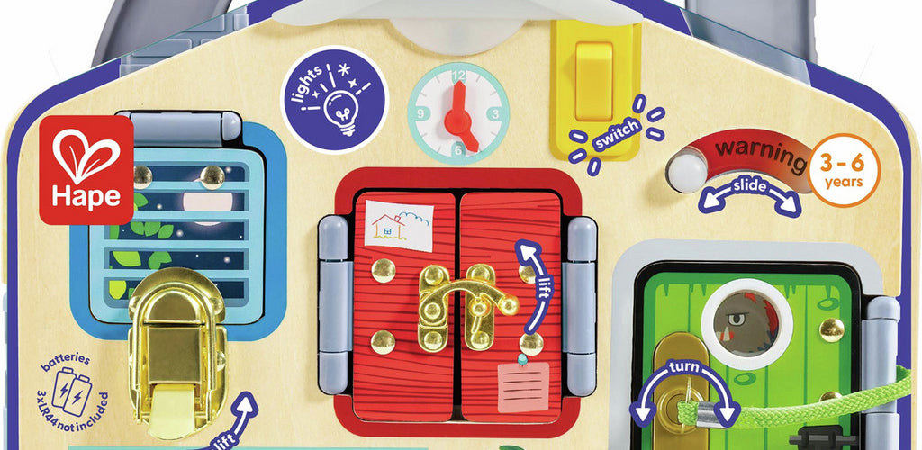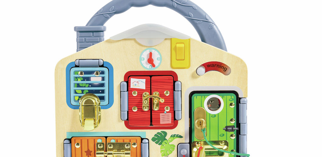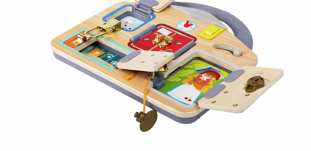 Interactive busy board designed to develop problem-solving skills through locks, doors, and secret passages