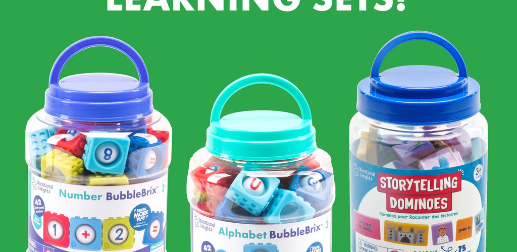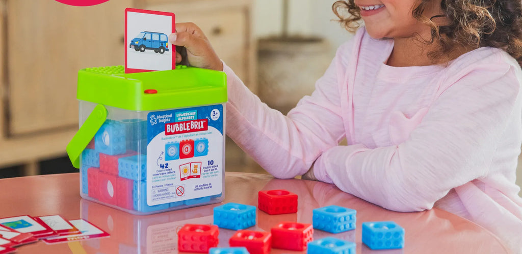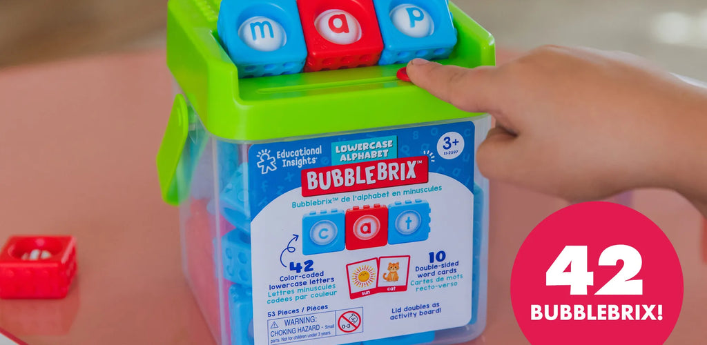 What’s in the box: 42 lowercase BubbleBrix blocks (color-coded consonants and vowels), 10 double-sided CVC word cards, and a storage bucket with lid that doubles as a play board
