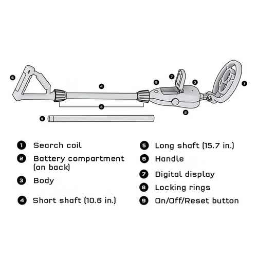 What’s in the box: 1 digital metal detector with adjustable angle sensor, 2 interchangeable handles (child and adult sizes), LCD display panel with built-in speaker, and an illustrated instruction manual. 🌟