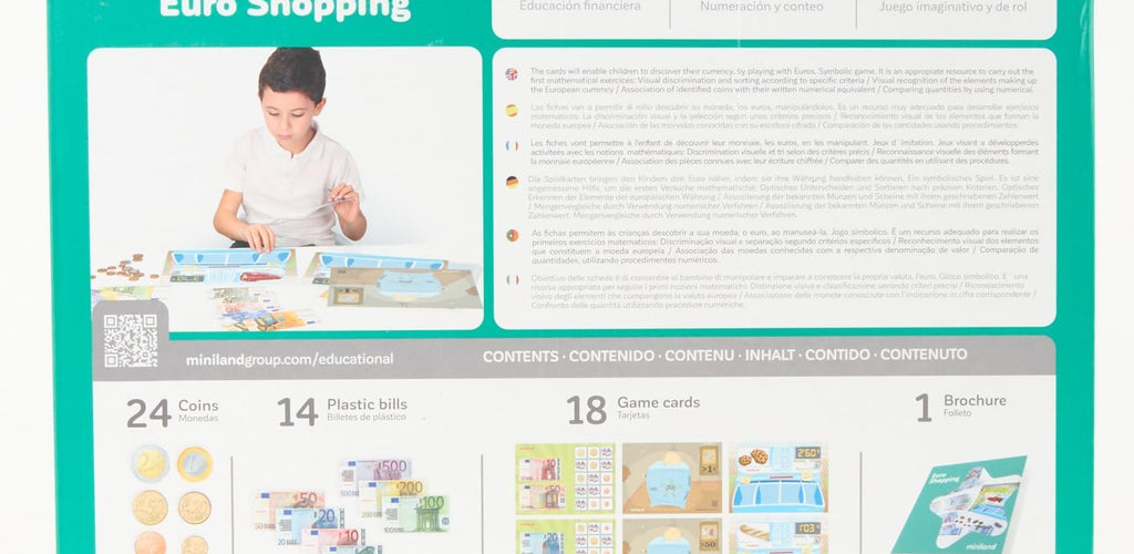 What’s in the box: Euro bills, Euro coins, shopping lists, task cards, and a plastic money tray