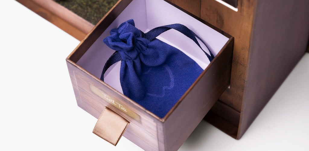A soft velvet tooth tote allows children to safely place each lost tooth under their pillow, making the tooth-fairy experience more exciting and memorable.