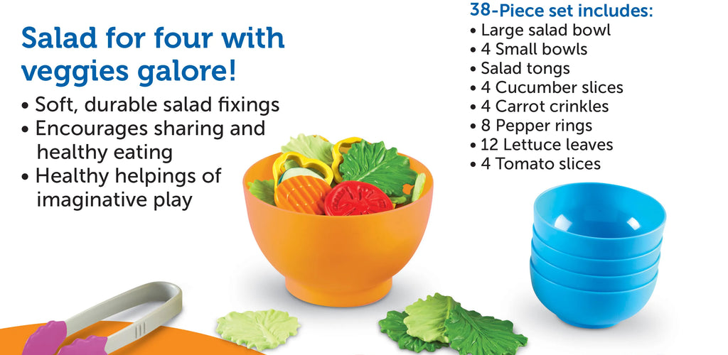 Helps teach concepts of serving, sharing, and nutrition as children build and mix their own fresh salads.