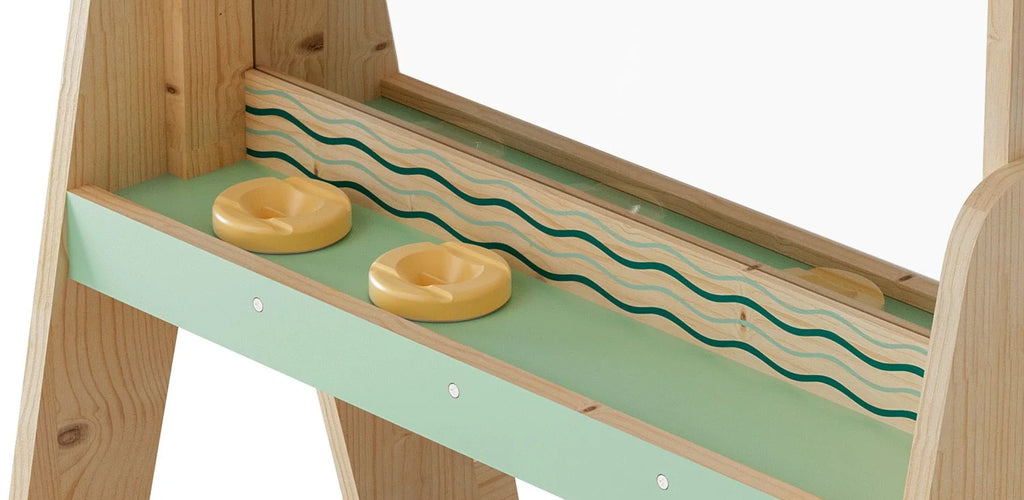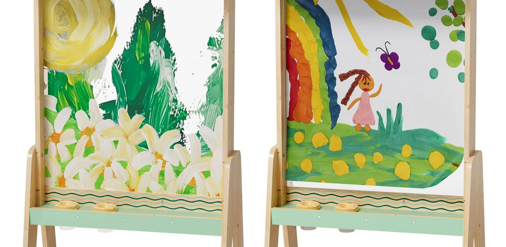 Dual-sided wooden easel with chalkboard and whiteboard surfaces for shared art sessions