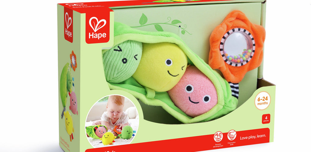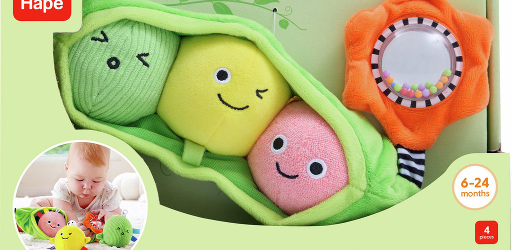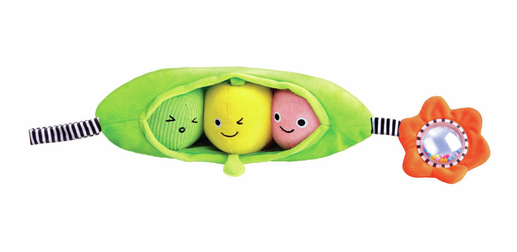 Includes three plush peas with unique textures and sounds for exploration.