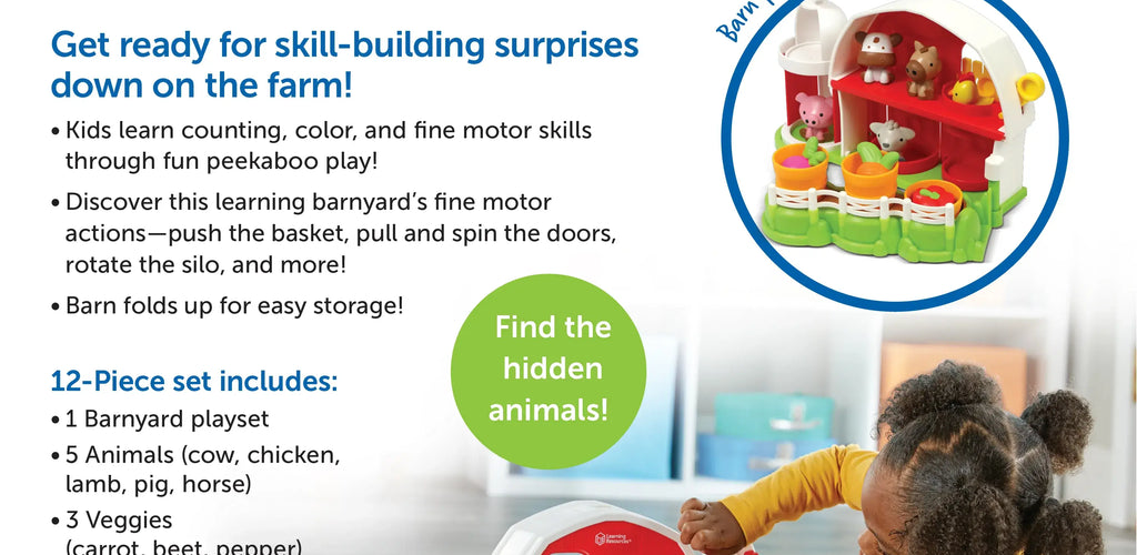 The Peekaboo Learning Barnyard Playset combines the magic of farmyard pretend play with essential early learning skills. With every barn opened and animal discovered, little ones build confidence, coordination, and creativity—making playtime both educational and full of joy. ✨