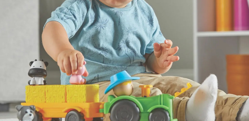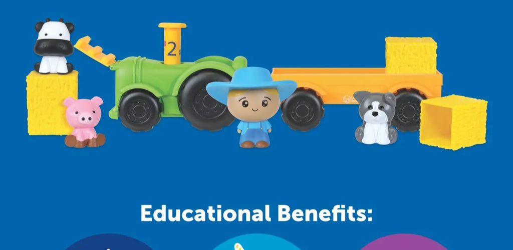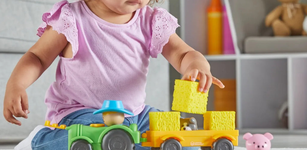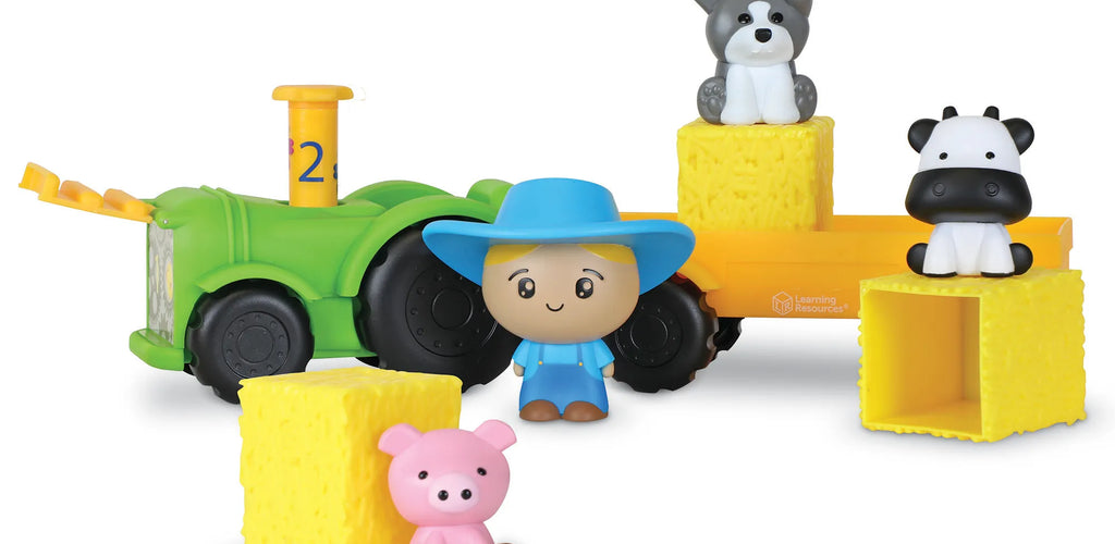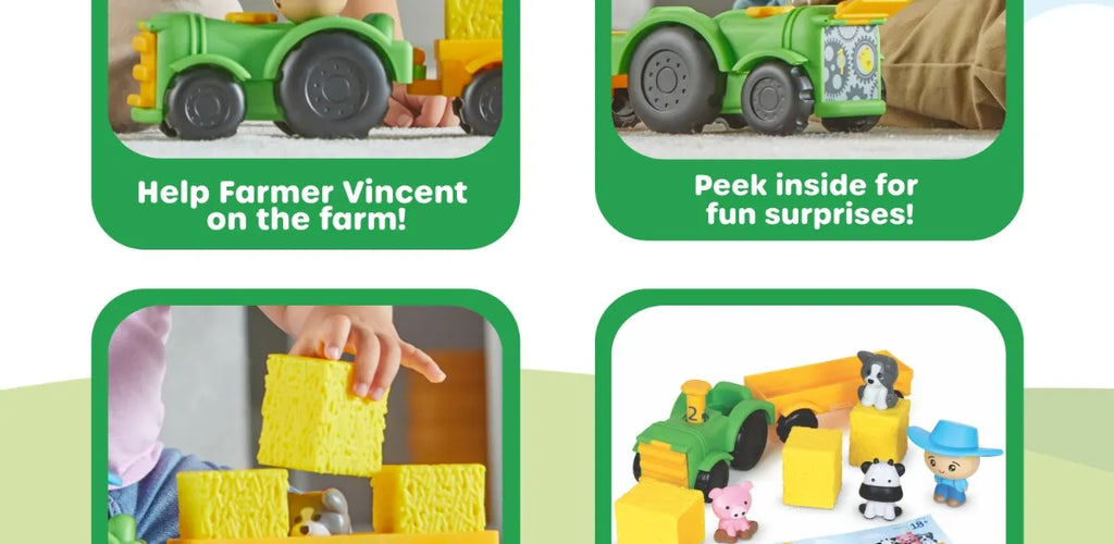 Children can lift hay bales, pop off pieces like the exhaust pipe, and discover surprises in the trailer, building fine motor skills and memory