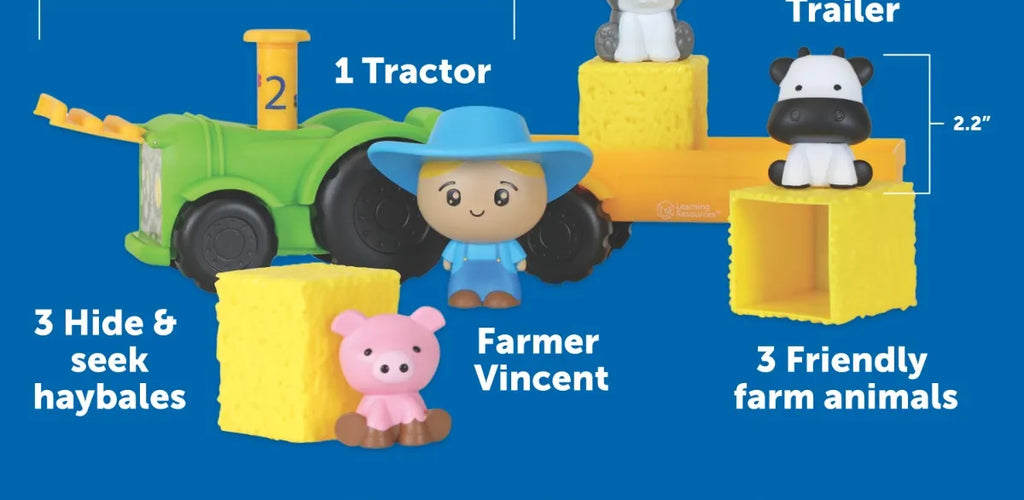 Chunky pull-along tractor with removable hay bales hiding six farm animal friends inside π