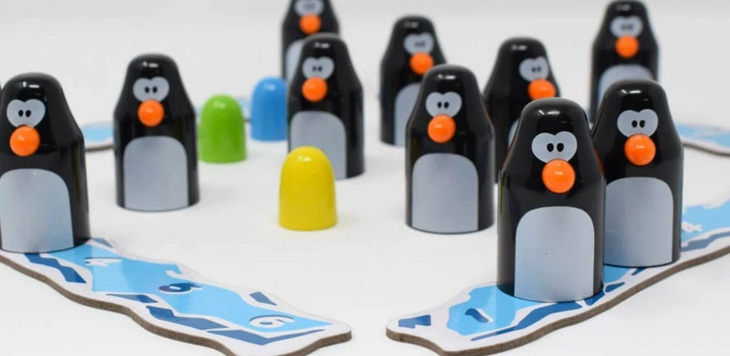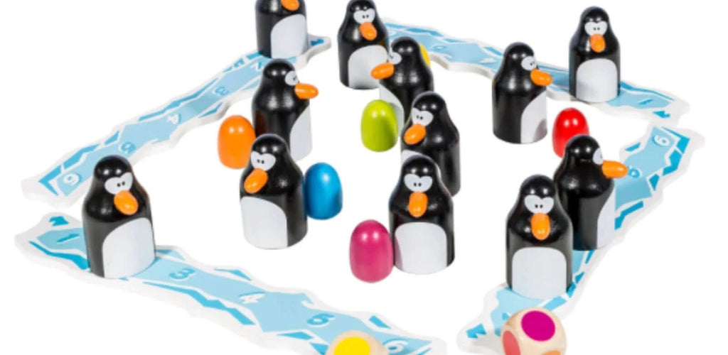 Includes 12 wooden penguins, 12 hidden eggs, 4 iceberg boards, and 2 color dice, all beautifully crafted