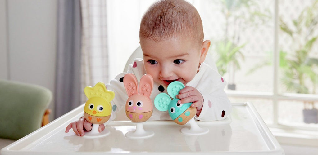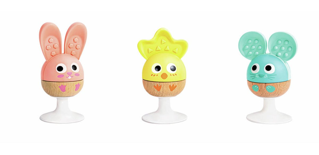 What’s in the box: 3 wooden and silicone critter rattles with suction bases.