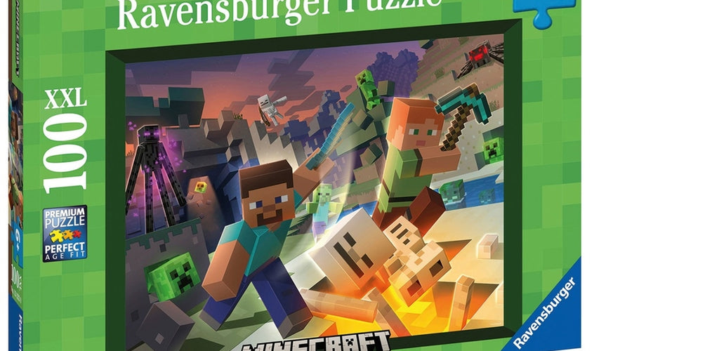 100-piece XXL puzzle showcasing iconic Minecraft scenes. 🧱