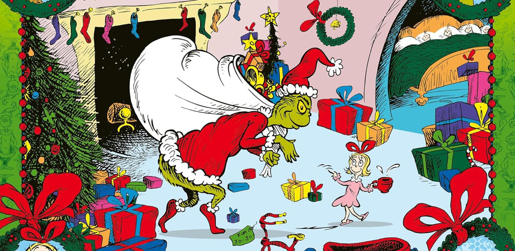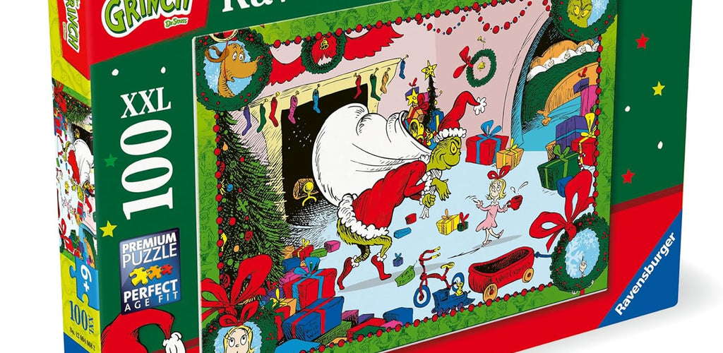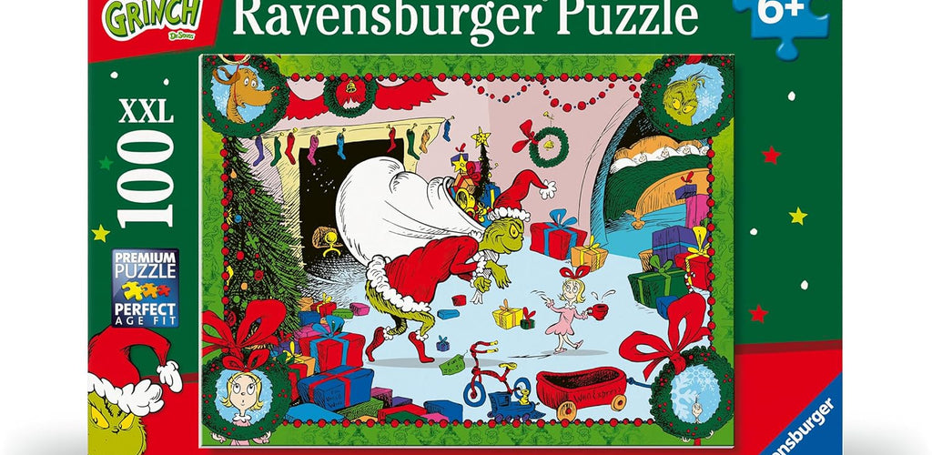 100-piece jigsaw puzzle with festive Grinch artwork for ages 6+. 🎄