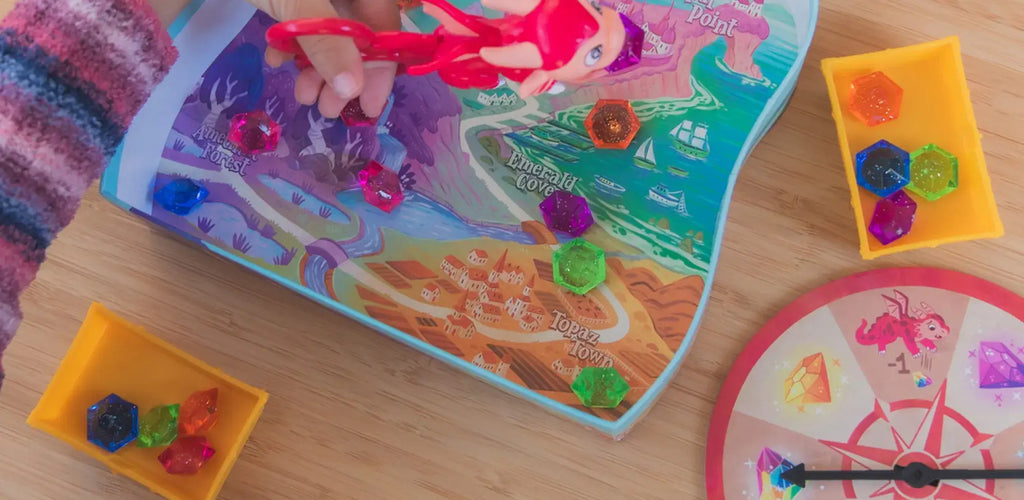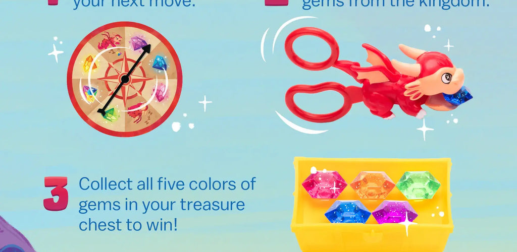 Includes child-safe scissors, colorful gem tokens, a game board, and activity cards for hands-on fun ✂️