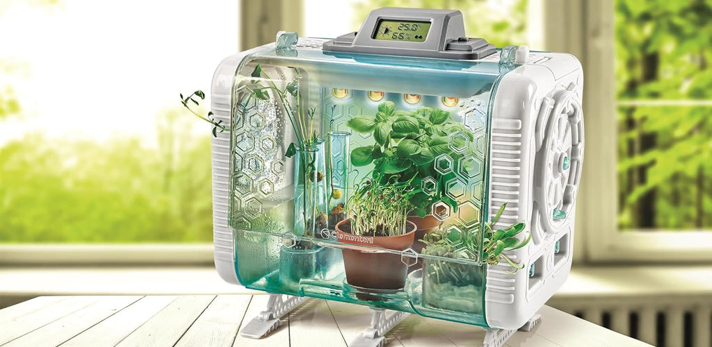 LED alert lights signal when plants need more water or when internal conditions change, giving young gardeners practical experience in plant care.