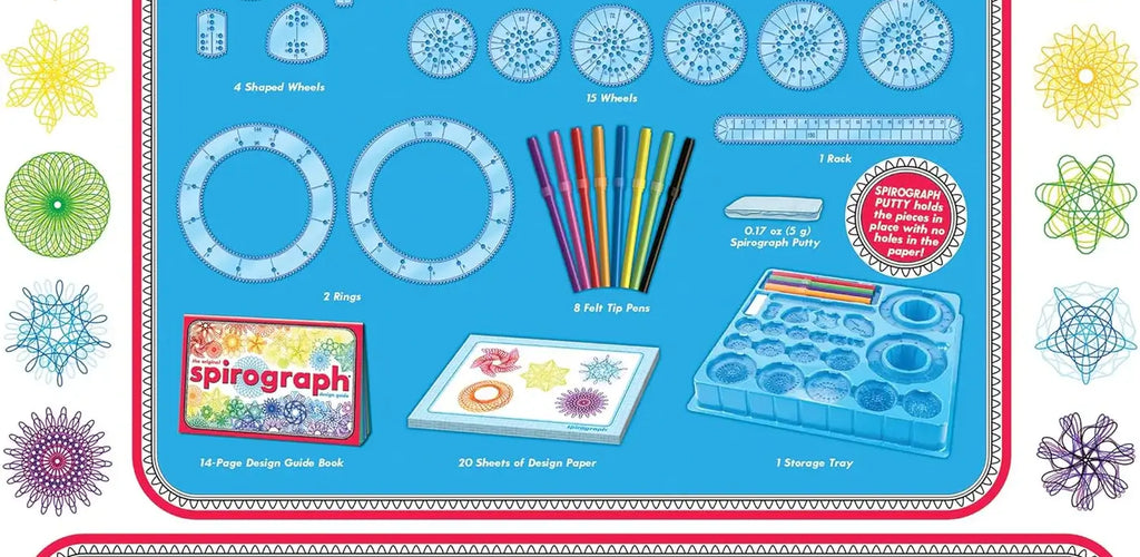 Includes 30+ pieces: 19 precision wheels, 2 rings, 1 rack, reusable Spiro-putty, 8 felt-tip pens, a 14-page guide book, 20 sheets of design paper, and a convenient storage tray