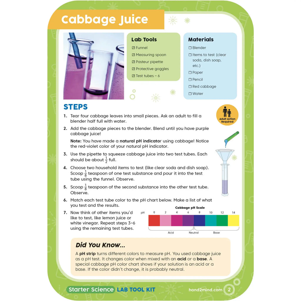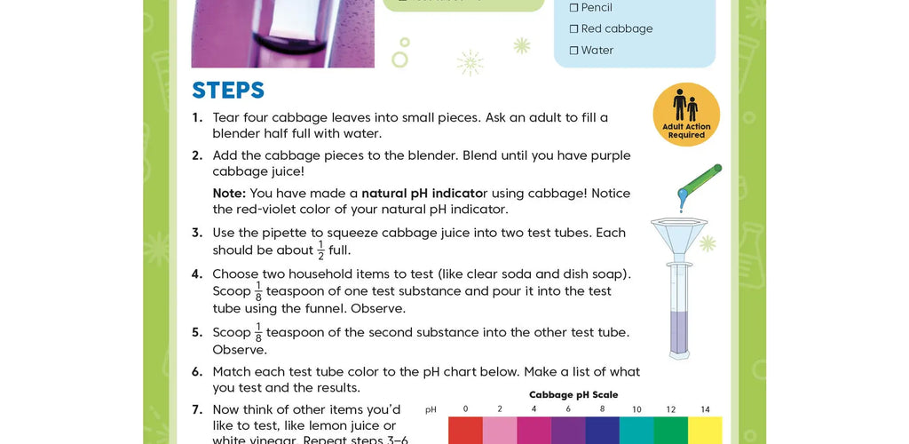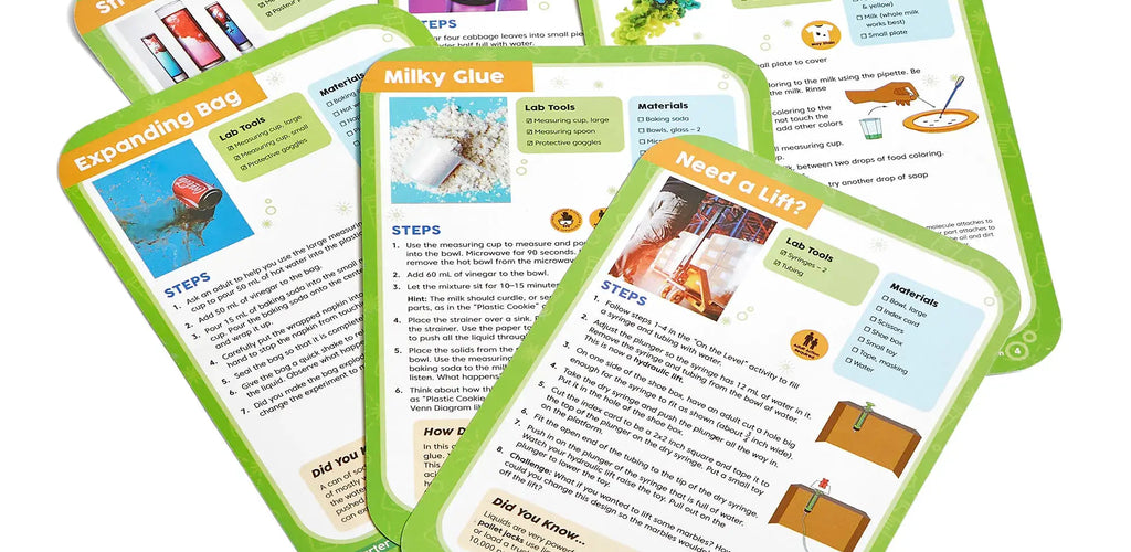 Includes 6 double-sided Experiment Cards that guide simple, “kitchen science” experiments using both kit tools and common household items