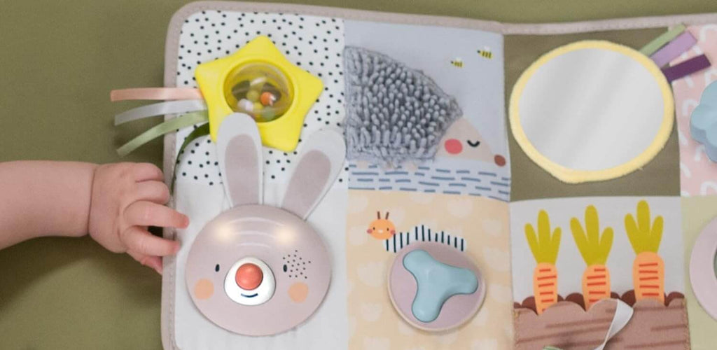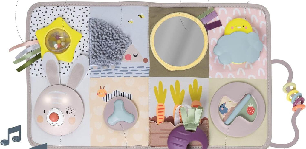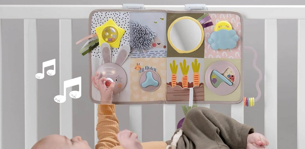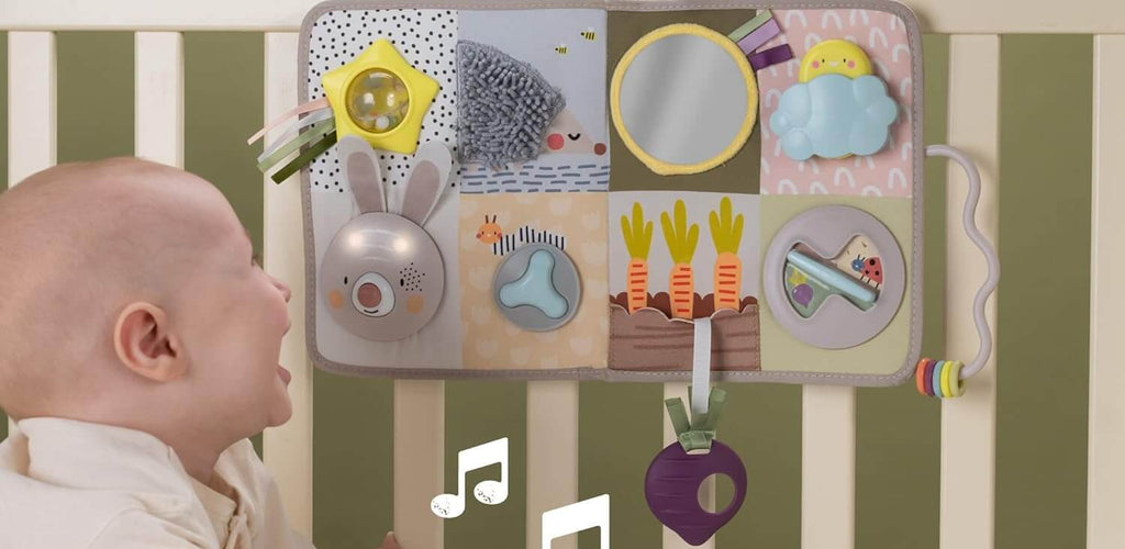 Features textures, mirrors, and rattles for sensory exploration