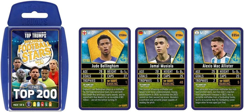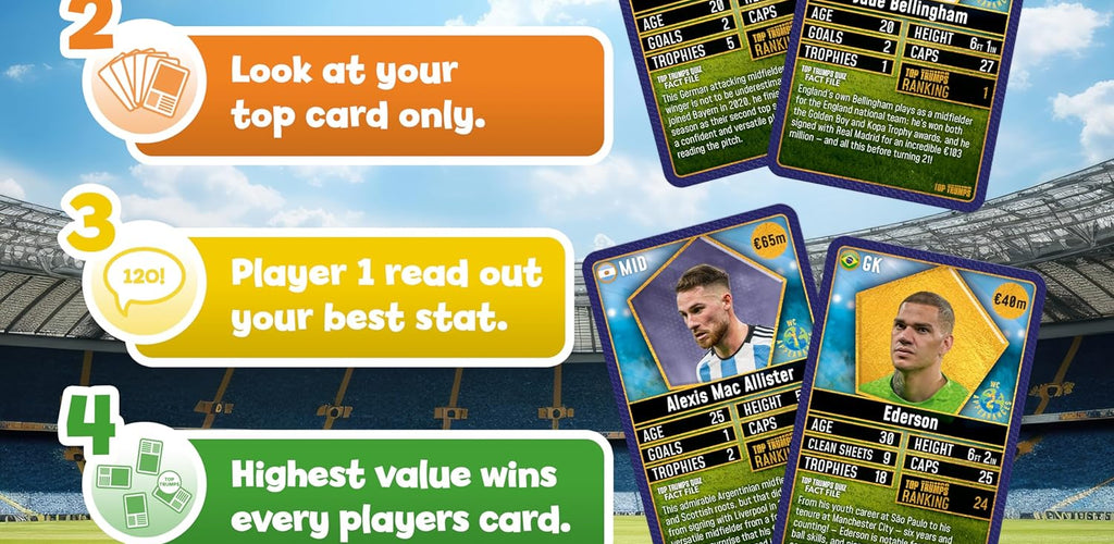 Introduces the Top Trumps format—compare stats like Goals, Speed, and Skill
