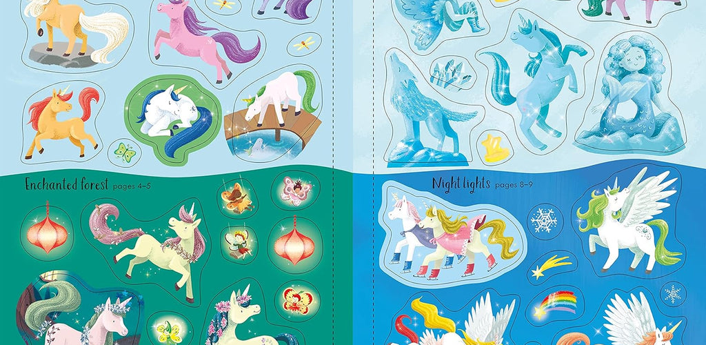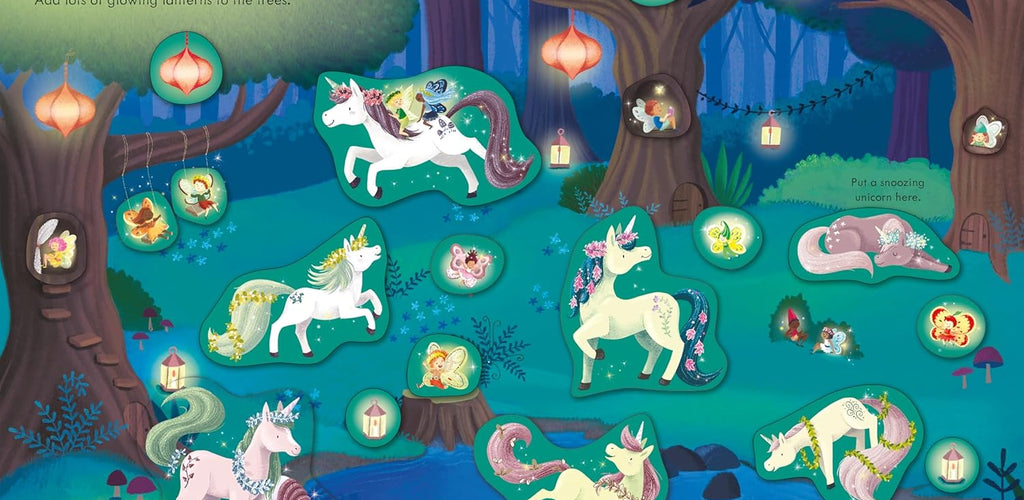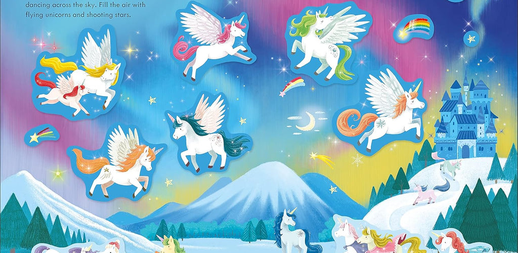 Step into a whimsical world where unicorns and fairies play among glittering waterfalls and crystal caves. With sparkly stickers to place and scenes to complete, this book offers hours of creative fun for little dreamers.