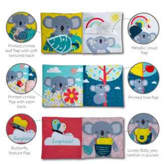 Soft, interactive stroller book featuring peek-a-boo flaps