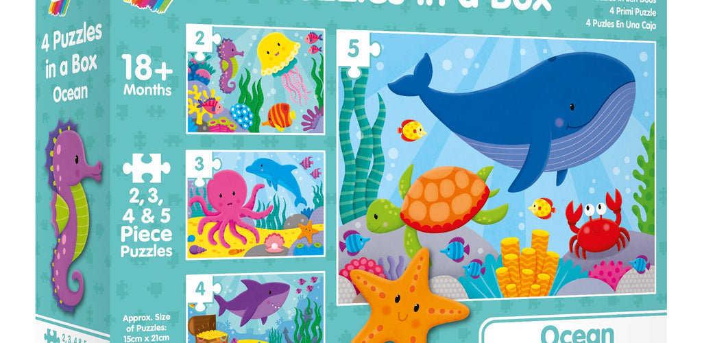 Whatβs in the box: 4 ocean-themed jigsaw puzzles (24, 48, 63, and 100 pieces) in a storage box.