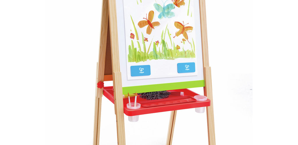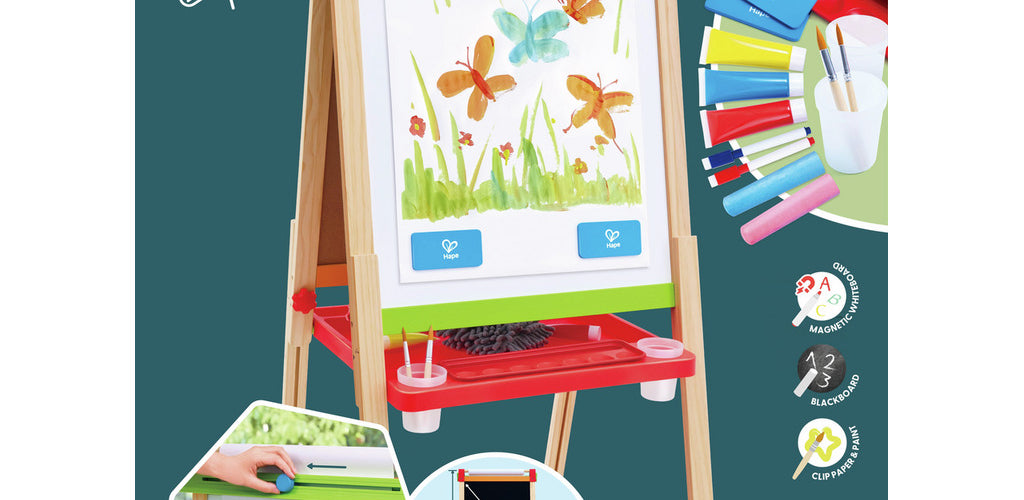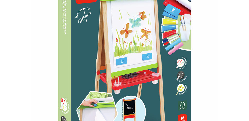 What’s in the box: double-sided easel, roll of paper, washable paint cup, plate, tray, and colour bucket.