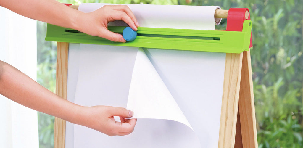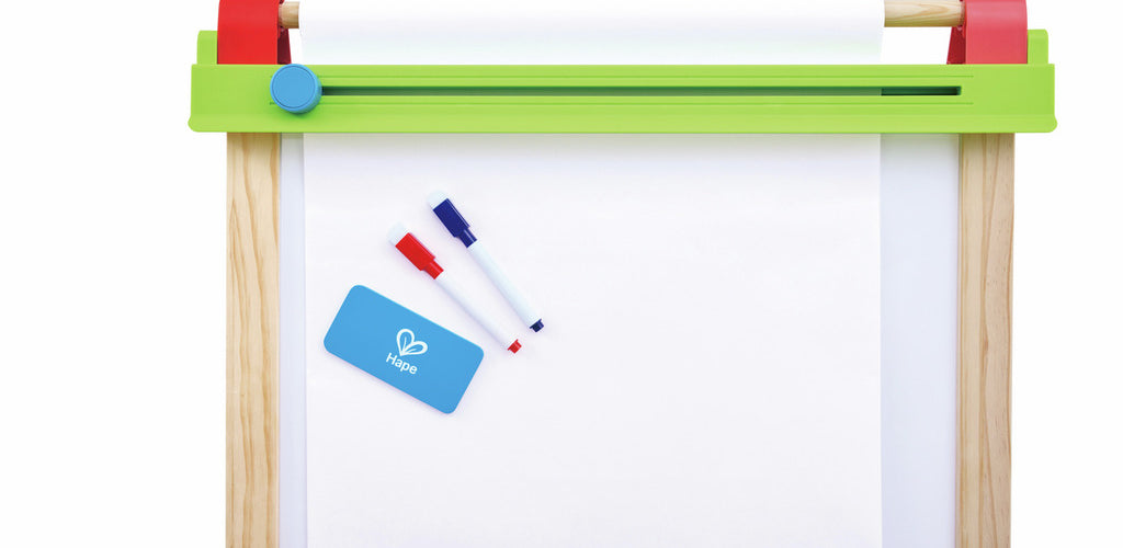 Double-sided design with a magnetic blackboard, whiteboard, and a roll of paper for drawing.