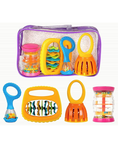 Includes Rainboshaker, Baby Maraca, Clip Clap, and Cage Bell