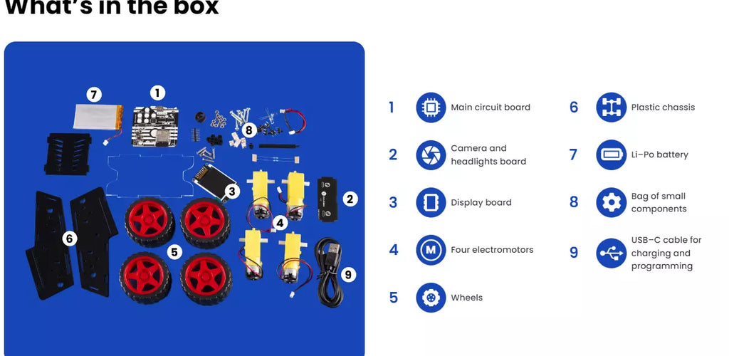 Main circuit board, camera module, 128Γ160 TFT color display, headlights board, motors and wheels, rechargeable Li-Po battery, plastic chassis parts, screws and spacers, USB charging/programming cable, acrylic casing, step-by-step build guide with 100+ photos, access to usage and coding tutorials, collectible card.