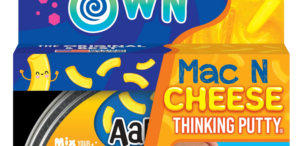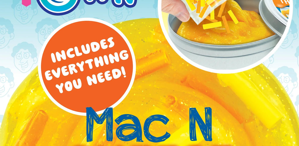 The kit includes clear base putty, a special “cheesy” color-izer, and fun mix-in pieces — so you get to create your own “mac & cheese” themed putty by mixing them together before you play.