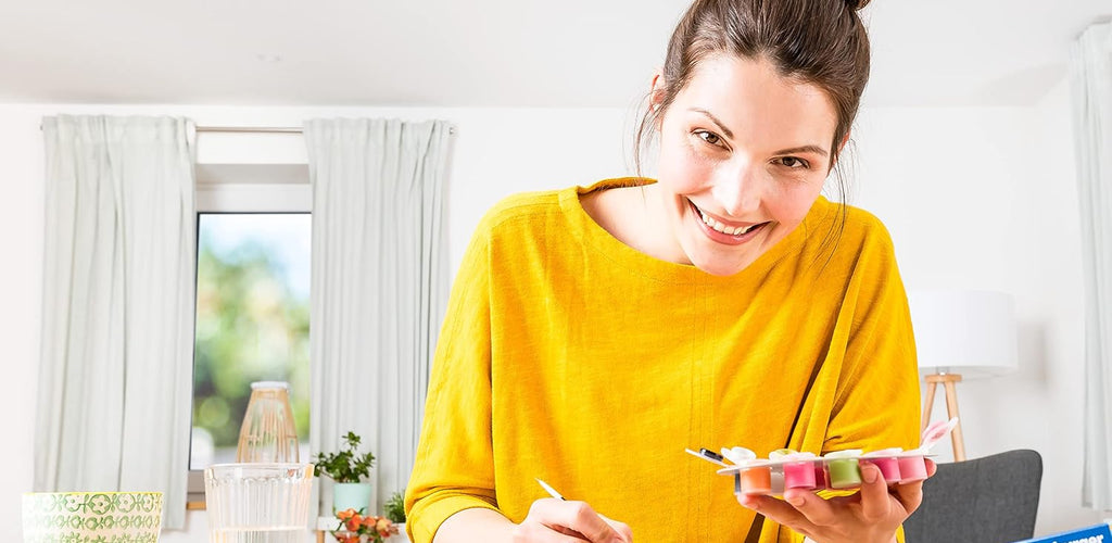 Includes numbered canvas, acrylic paints, brush, palettes, varnish, and frame.