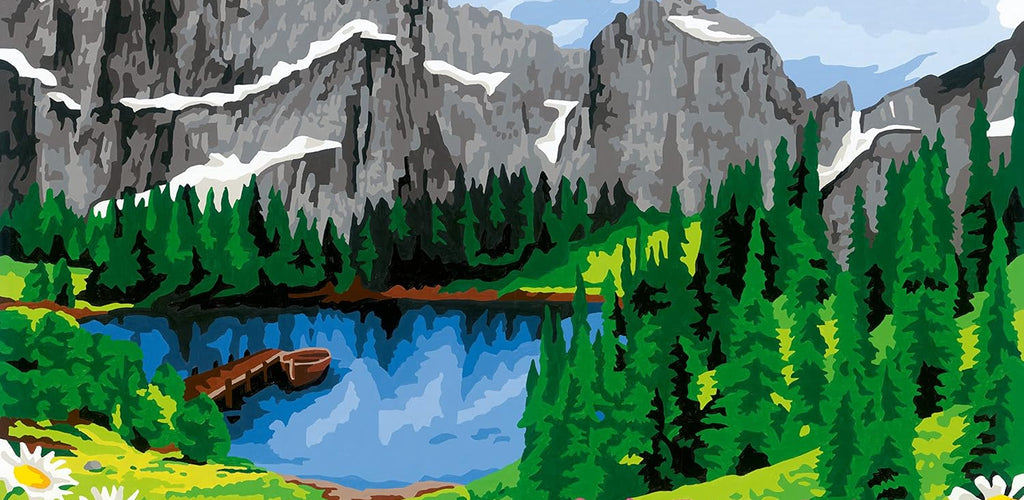 Paint-by-numbers kit featuring a beautiful mountain landscape.